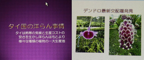 タイのラン園、ラン展の状況を沢山のスライドで紹介して頂きました。