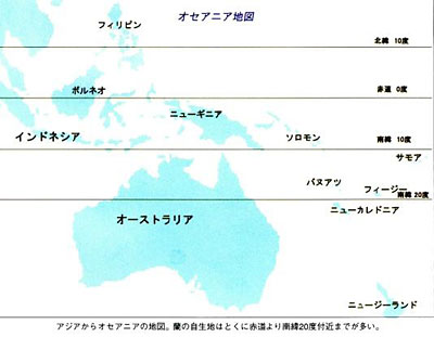 オセアニアの蘭の自生地は赤道付近で、ニューギニア340種を中心にソロモン諸島51種、オーストラリア65種、フィジー18種、サモア15種、ニューカレドニア36種が主な自生地です。