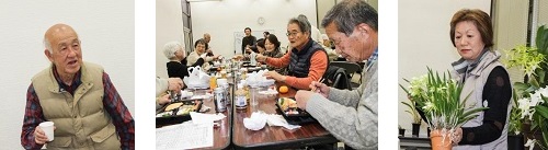 新年会 野崎さんの音頭で乾杯を行い、野村陽子さん、菊池恵美子さんに手配して頂いたお弁当を頂きました。 毎回のことながら、石井さんから差し入れて頂いた漬物やミ カンもおいしく頂きました。